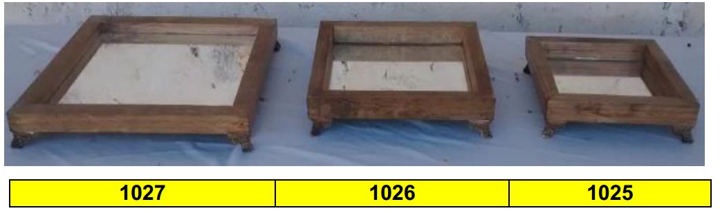 Bandejas em madeira maciça nas medidas 25x25, 20x20 e 15x15 com fundo espelhado, detalhes em resina no estilo provençal e pintura envelhecida.